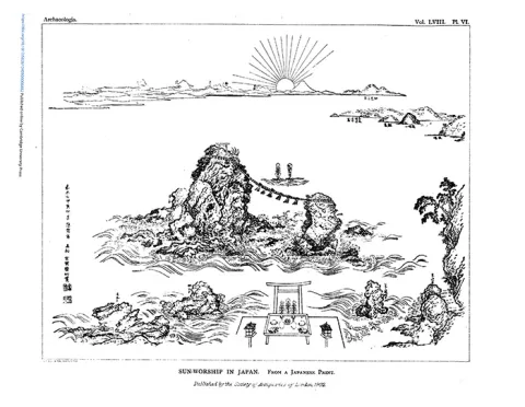 William Gowland drew on his knowledge of Japanese archaeology when publishing his findings at Stonehenge. The report highlighted the significance of sun worship in Japan, and – as shown here – used woodblock prints as illustrations. [Image: Gowland and Judd (1902) ‘III. Recent Excavations at Stonehenge’. Archaeologia 58: 37-118]